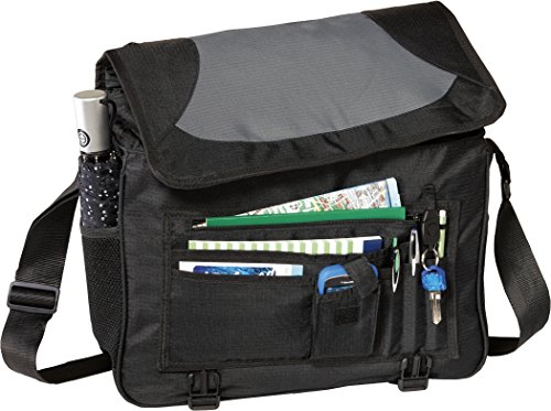 Product Description ZUZIFY Business-Ready Messenger Bag. EF0716 Our light durable messenger bag is business-ready and full of convenient storage space. 100% ripstop polyester Main zippered compartment with hidden buckle closures Adjustable shoulder strap Two mesh water bottle holders Front flap features easy-access zippered pocket Clips closed and has a main zippered compartment Dimensions: 11-1/2"h x 16-1/4"w x 5-3/4"d Approx. 1075 cubic inches 0