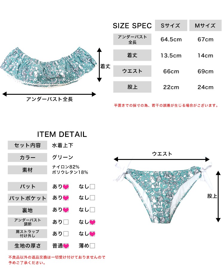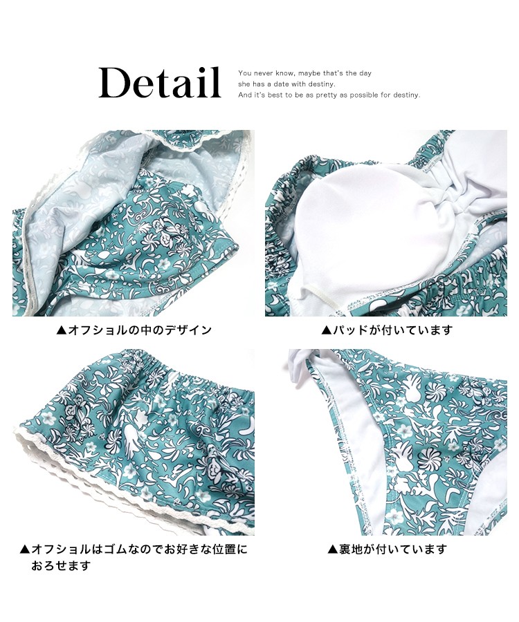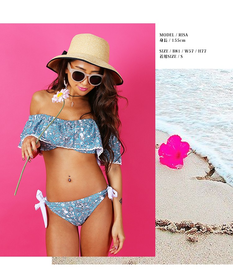 | 商品特徴 | LAVIA(ラヴィア)から新作のプチプラ水着が入荷しました。インポートならではの柄ミックスと大きめのフリルが目を惹くビスチェ水着。フリルの中にはしっかりとしたパットが入ったベアトップが付いており胸が小さめとお悩みの方にもオススメ!肩やデコルテにかけて伸縮性のあるギャザーが入っているので肩をおろしてオフショルとしても着ていただけ気になる二の腕もカバーしてくれます! 【特徴】 エスニックな柄にさわやかな色味がリゾート感を漂わせるこのビキニは肩をおとしてオフショルとしても着用できます!同じ柄のショーツはサイドリボンがポイント!そのままかぶり着用できるので着脱しやすく水中でホックが外れる心配もありません! |