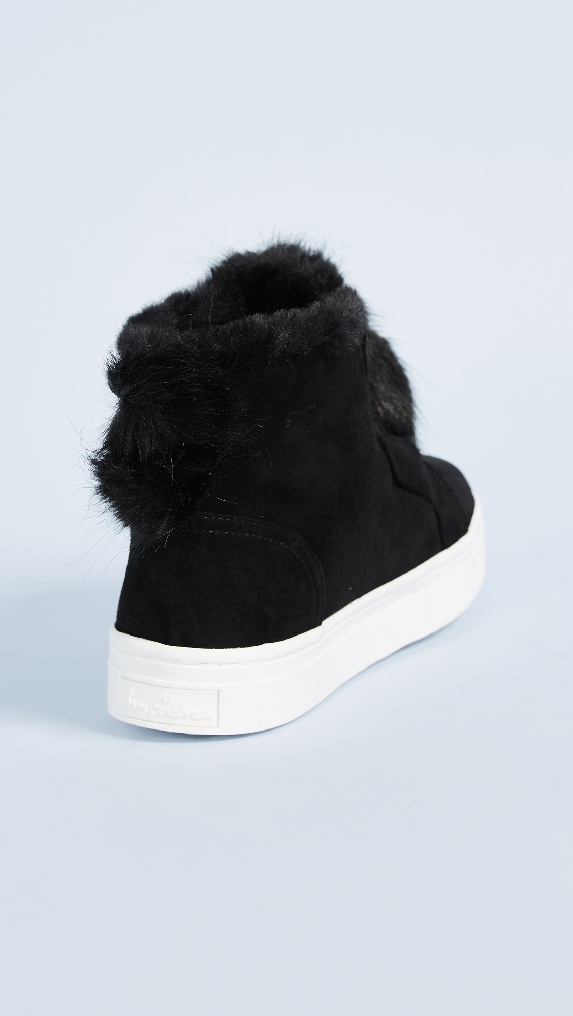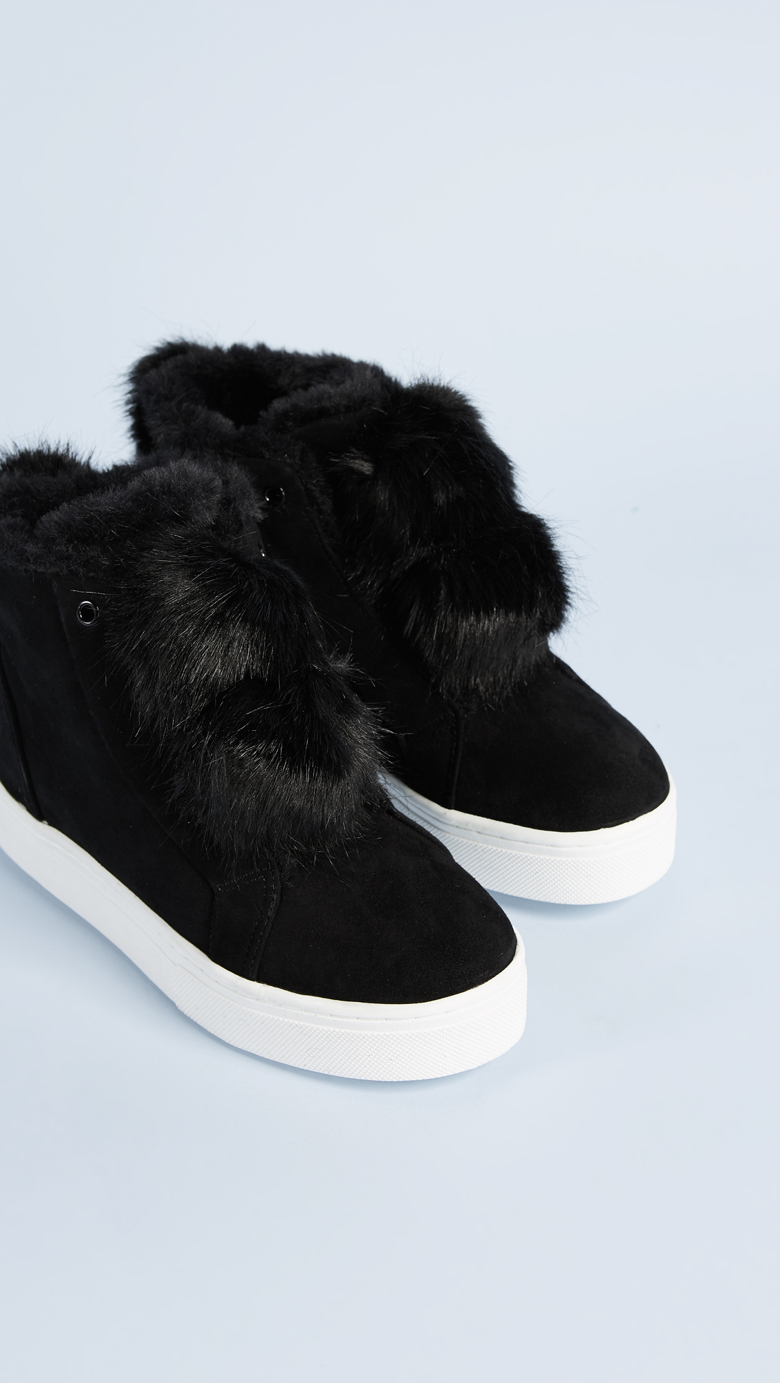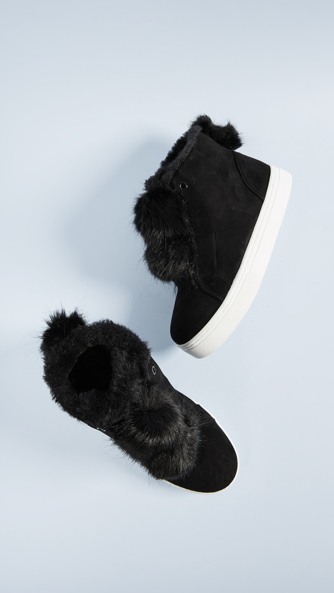 Suede Sam Edelman sneaker booties trimmed with tonal faux fur. Pom-pom trim and elastic gore insets. Rubber sole.