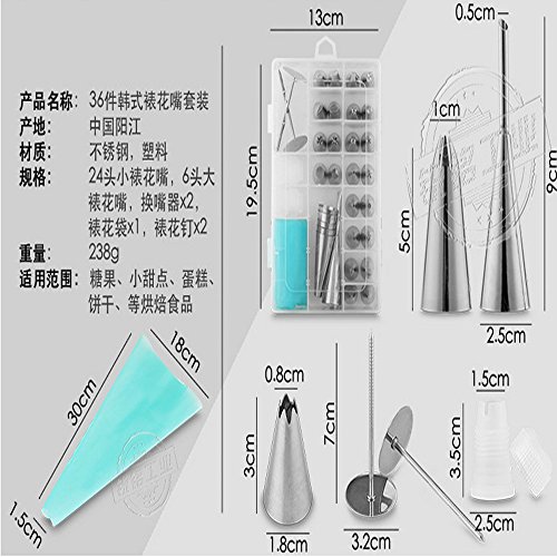 PROFESSIONAL CAKE DECORATING SET. Comes with 30 nozzle tips and casing, 1 piping bag, and 4 coupling to decorate pastries, cakes, biscuits, pies, cookies, and more