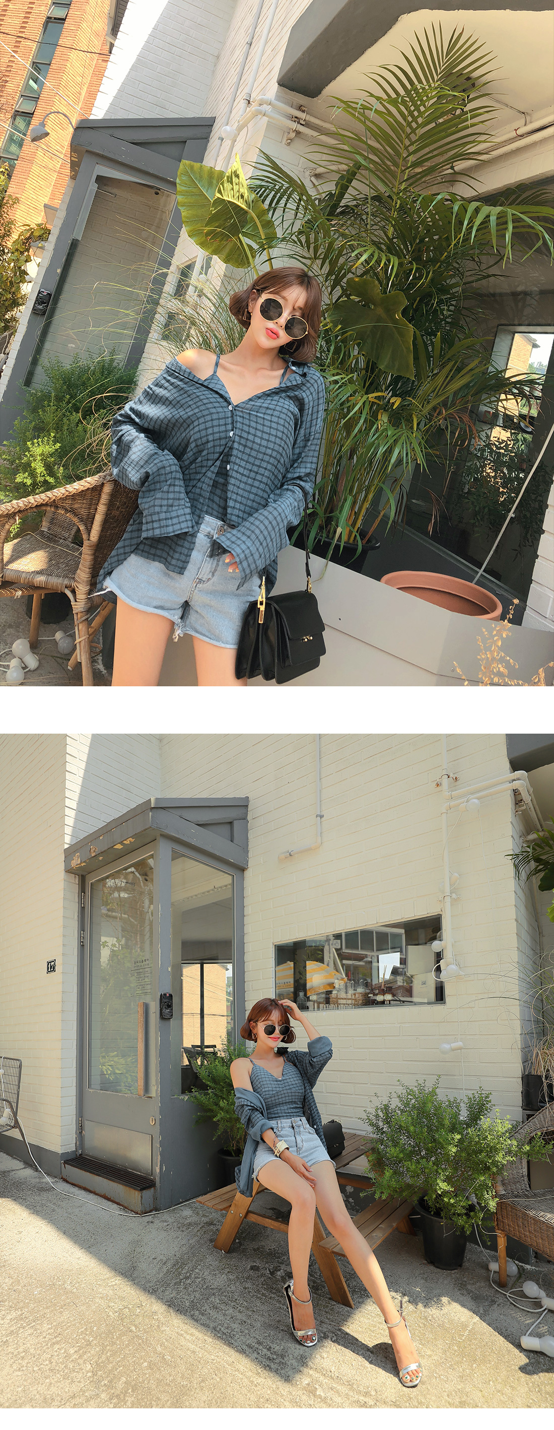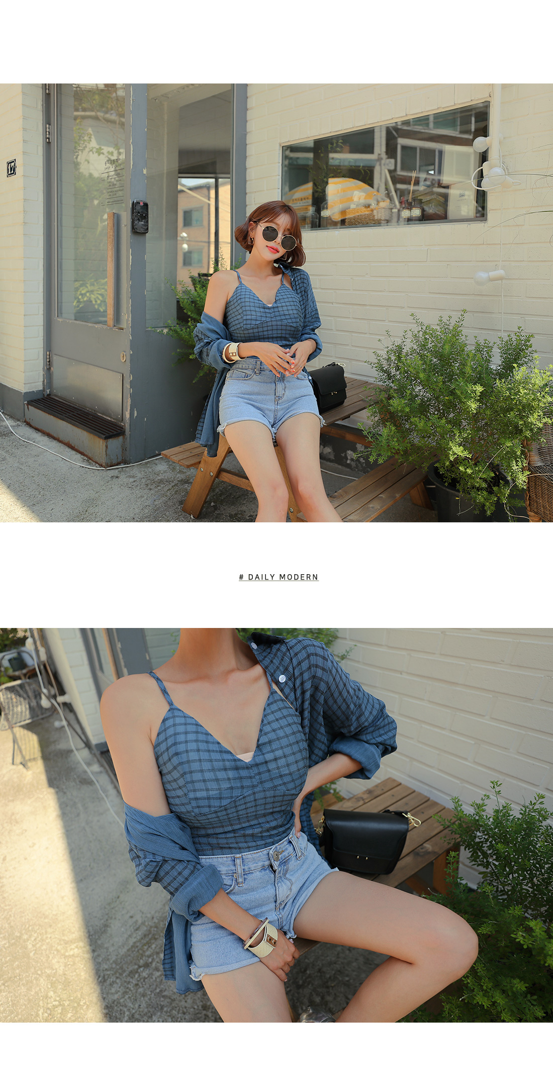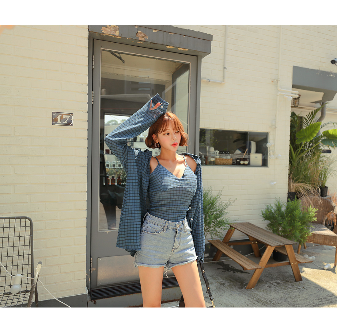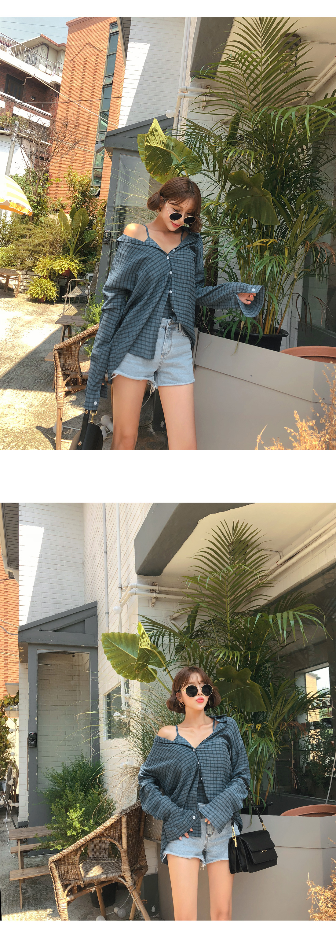 MD COMMENT은-근 섹시한 분위기의 셔츠슬리브리스세트 아이템을 소개할게요.루즈한 핏감의 셔츠와 캡 슬리브리스가 세트로 구성된 아이템인데요.전체적으로 잔잔한 체크 패턴으로 룩에 포인트를 주었으며트렌디한 느낌을 더해주었어요.슬리브리스는 어깨끈에 조절이 가능한 버클이 달려있어조절하여 착용하실 수 있으며백라인에 스모크 밴딩으로 편안하게 즐겨입기 좋아요.패드가 내장되어 있어 단독으로도 착용가능하구요.살짝 숏-한 기장감으로 하의아이템과 매치하였을 때한층 더 길어보이는 레그라인을 연출할 수 있답니다.셔츠는 기본 카라디자인으로 제작되었으며전체적으로 루즈한 핏감과 힙을 덮는 기장감으로은근 여리여리한 실루엣을 연출해주는데요.오픈클로징은 프론트 단추로 손쉽게 도와드렸구요.SET로 착용하여 완성도 있는 스타일 연출이 가능하며단독으로도 다양한 아이템과 매치하여 멋스러운 룩을 연출해 줄세트 아이템으로 추천할게요!COLOR/SIZE블루,블랙FREEMODEL FITTING블루/FREE