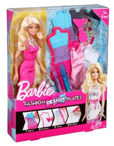 Barbie doll comes with six double-sided fashion plates, three dresses to design, three markers, one sticker sheet, three sheets of charcoal paper, one tool, and one base unit.
