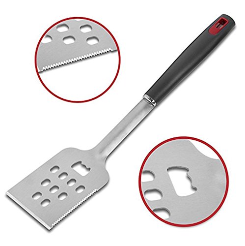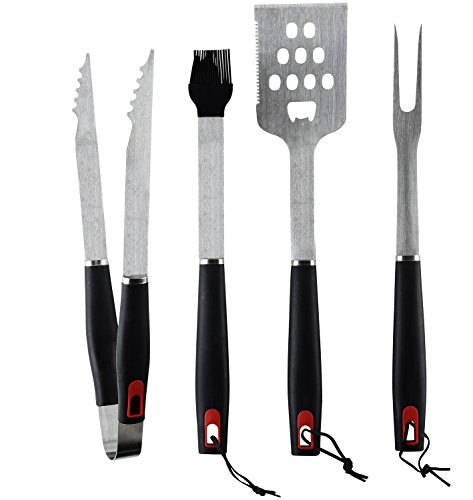 COMPLETE EXPERIENCE: Our 4-piece Barbecue grill set includes a tong, meat fork, silicone basting brush, and 3-in-1 spatula – spatula, beer bottle opener and very sharp knife.
