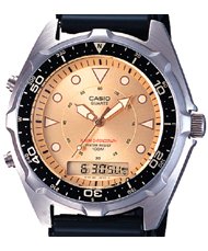 Stylish enough for the boardroom but rugged enough for the wakeboard, the Casio Marine stainless steel analog-digital watch for men (model AMW320D-9EV) combines the timeless look of an analog watch with the functionality of a digital watch. This analog digital combination allows you to see up to 2 times or the date with day of the week. The round silver stainless steel case measures 40mm wide, and it's complemented by a black resin sports strap. The inner rim of the bezel provides an Arabic numeral readout with small minute indexes, and the gold face includes luminous hour markers, oversized luminous hands (with seconds hand), and a digital window above the 6 o'clock mark. Timekeeping features include dual time, a daily alarm, auto calendar, and a 1/100-second stopwatch with a 24-hour capacity. Other features include a ±30-second accuracy per month, scratch-resistant mineral crystal, and water resistance to 100 meters (330 feet)--offering protection from accidental splashes as well suitable for swimming, snorkeling, and light recreational diving.