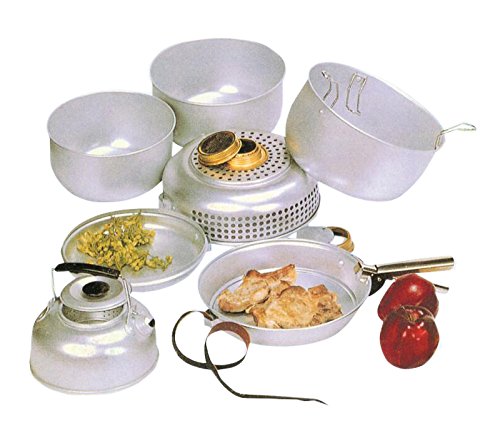 -. Feature : Only position and operate the cooking stove on a level, flat surface. Adjust the lower wind protection device so that the small opening faces upward and the vent holes are positioned contrary to the wind. / Remove the screw lid from the burner. Fill the burner with denatured alcohol. One burner filling (max. 2/3 of the level) suffices for a burning period of approx. 25-30 minutes. / Connect the extinguishing attachment and suspend the burner into the opening of the lower wind protection device. Now open the regulating cap in the extinguishing attachment. To simmer on a low flame, swivel the cap aside only partially. / Firmly connect the upper and lower wind protection devices by placing the small opening of the upper wind protection device onto the lower wind protection device, so that the nibs engage into the notches, and then twist it around one quarter of a turn. / To use the saucepans, fold down the wire holder in the upper wind protection device and insert the saucepan. To use the frying pan, swivel the holders upward and insert the pan.