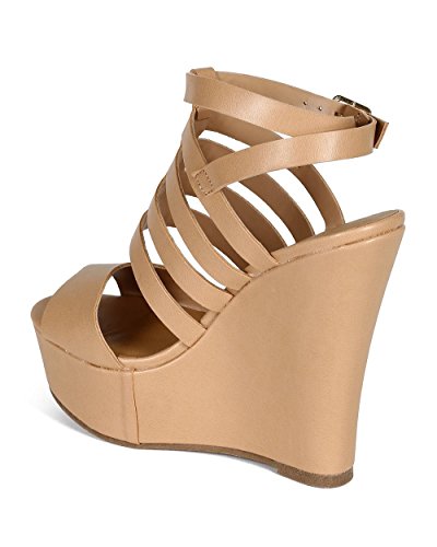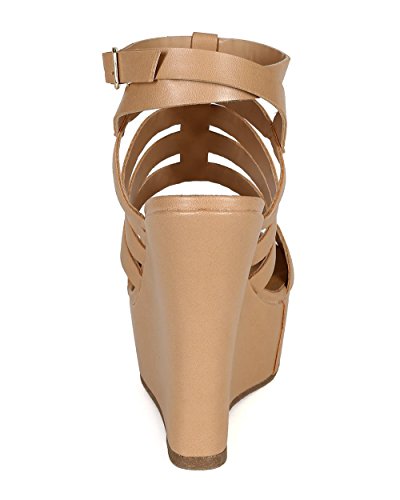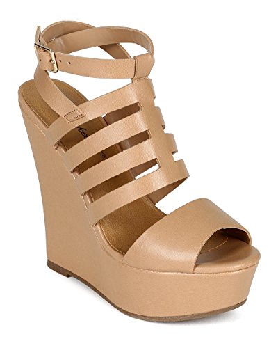 Breckelles CC70 Women Leatherette Open Toe Caged Ankle Strap Platform Wedge Sandal - Natural