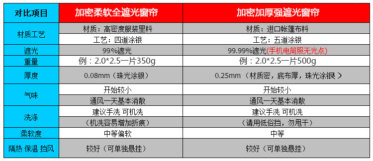 工 艺 | 窗帘:高强度双面珠光防水涂层,有薄款和厚款,重量相差30%左右 | 遮光度 | 强光照射无光点,暗无天日 |