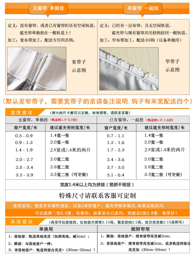 备 注 | 本品单位为片,即成品,拿到后直接可以挂,可定做特殊尺寸,如定做特殊尺寸不接受无理由退货。 | 推荐 理由 | 环保型遮光成品窗帘布料,酒店宾馆全面改用此款遮光布,使用年限十年以上!不同于别家只有薄款单面涂银水洗或者加厚不可水洗,本遮光窗帘厚款和薄款都是双面高强度涂银,都可以水洗! ? |
