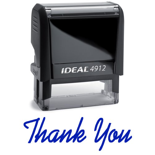 -. Feature : Self-inking design is ideal for quick, repetitive stamping / Durable plastic construction promises long-lasting use / Message: "Thank You" / Impression Area: 5/8" x 1-13/16" / P.R.Ints in blue ink
