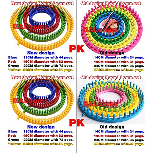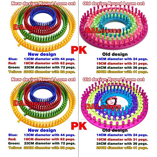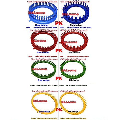 1.Yellow Round Loom: 82 pegs (28cm) =half loom color peg+ half extra pink pegs2.Green Round Loom: 72 pegs (23cm)= half loom color peg+ half extra pink pegs,3.Red Round Loom: 62 pegs (18cm)=half loom color peg+half extra pink pegs4. Blue Round Loom: 44 pegs (13cm)=half loom color peg+ half extra pink pegs