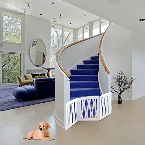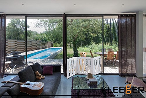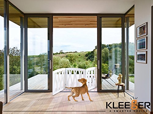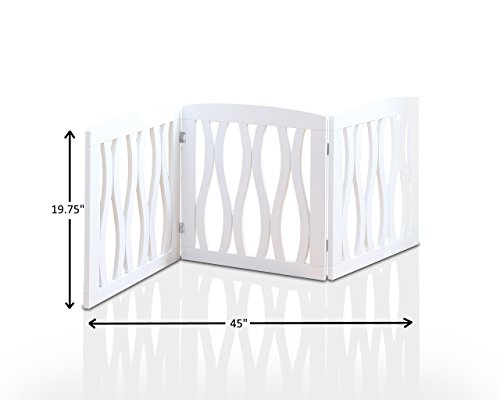 -. Feature : Our Kleeger Pet Gate Is Great For Blocking Hallways, Stairways, Doors, And Entry Ways, Or Any Area That You would Like Your Pet Not To Enter. Great For Your Home Or Office. / The Free Standing "Z" Design Was Designed In A Way That Requires No Tools For Setup, Simply Unfold The Pet Gate Into A "Z" Pattern / The Gate Is Portable And Light Weight, Made With Real Wood & A Beautiful White Finish & Decorative Cascade Wave Design, Which Is Elegant And Modern & Will Add Some Design To Your Home / The Gate Will Adjust To Fit Openings Up To 45" Wide. The Product Dimensions Are 19.75" Tall X 47.5" Wide While completely extended. Not Meant For Very Big Dogs Unless The Dog/Pet Is Trained Properly Not To Go Past The Gate / Folds To 19.75" Tall x 15.75" Wide For Easier Storage While Not In Use