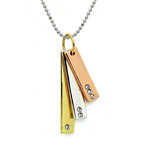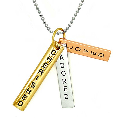 This three part necklace will make you look good and feel good! A trio of bar pendants, in gold plated, rose gold plated and silver plated, are dotted with clear crystal stones for just the right amount of sparkle and a meaningful message is hidden on the reverse. The three words "cherished, adored and loved" will be there to remind you that you are loved each time you wear this pretty piece. Delicate ball bead chain length is 28" plus extender chain.  Great for layering!  ÂFeature