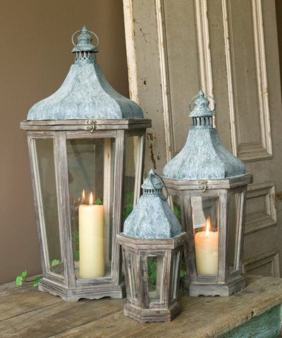 -. Title : Wood and Galvanized Metal Lanterns Set of Three