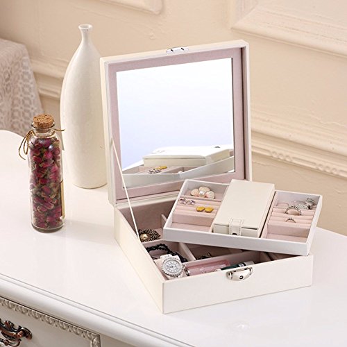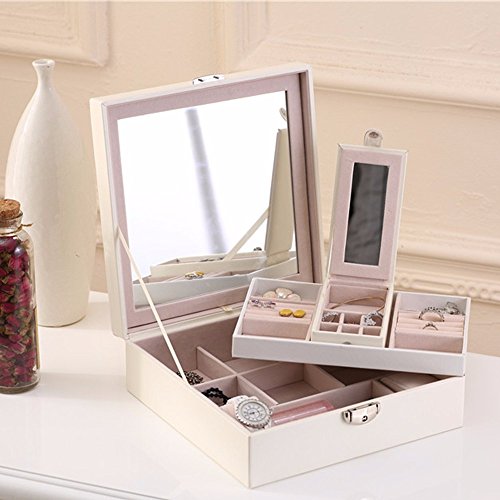 Soaptree Lockable Womens Jewelry Organizer Large Removal Make Up Jewelry Box,Mirror & 2 Trays & 1 Small Travel Jewelry Box (B-White)