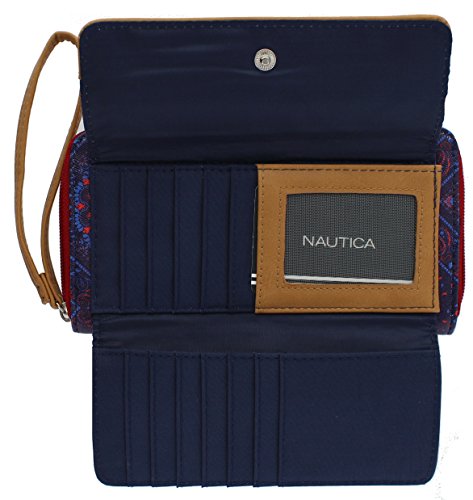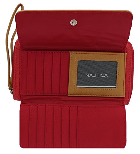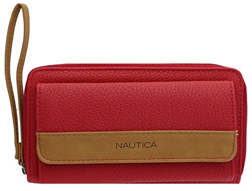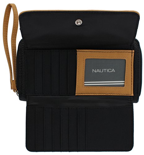 -. Binding : Apparel -. Brand : Nautica -. Department : womens -. Feature : • Measures 7.50" x 4.25" x 1.25". Pebble Faux Leather with Vachetta Color Block / • RFID Blocking Protection Will keep your identity Safe from Thieves that can scan your wallet / • Zip-around first compartment with 5 open pockets, 6 credit card slots and 1 zipper pocket for coins / • Snap Clip 2nd compartment with 2 open pockets , 12 credit cards slots and 1 ID Window / • NAUTICA Stamped Logo. -. ProductGroup : Apparel -. ProductTypeName : ACCESSORY -. Size : One Size -. Title : Nautica Land Lubber Ocean Zip Around Organizer Wristlet With RFID