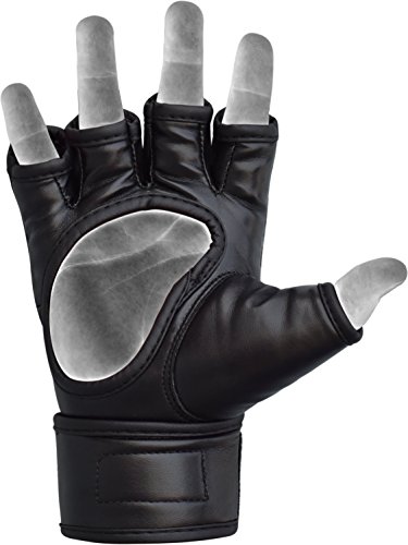 -. Feature : Resilient Maya Hide synthetic construction makes these MMA gloves stubbornly durable and long-lasting / Polymax contoured Tri-Slab PC3 padding curves over knuckles to deliver efficient protection against shock-impact / Our improved Quick-EZ Velcro closure gives a comfortably snug fit and supports the wrists / Moisture wicking synthetic microfabric draws moisture away from skin enabling hand-comfort and breathability / D.Cut palm-side design promotes moisture escape while offering better grip and an added thumb sheath