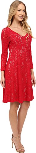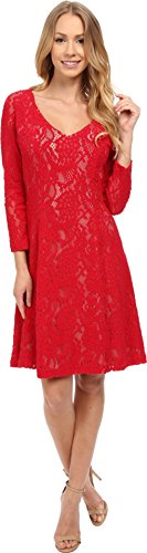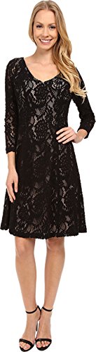 Three-quarter sleeve dress with V-neckline and lace overlay