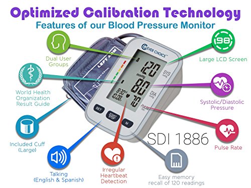 Studio : Simple Diagnostics Publisher : Simple Diagnostics Binding : Health and Beauty Product Description Keep track of your heart health with Clever Choice blood pressure monitors. The talking blood pressure monitor includes a standard D-Ring cuff that fits adult arms measuring between 8.6" to 16.5 inches. The digital sphygmomanometer allows you to accurately track of your systolic/ diastolic blood pressure and heart rate with date stamp easily at home. English and Spanish Talking functions and large LCD display allows for all ages to use, especially the seniors. Tips to Measure Blood Pressure at Home: Clever Choice Premium Talking Automatic Digital Blood Pressure Monitor This stylish monitor with the most advanced features and wide range cuff (8.6"~16.5" - 22~42 cm) will help you easily keep track of your blood pressure in the convenience of your home. With clinically accurate results you can count on, you'll have peace of mind knowing you are doing your best to keep yourself and your family healthy. The 120-reading memory stores up to 60 readings each for two people, meaning you can keep track of yourself and another family member using the same monitor. It even averages the last three readings so you can get a more accurate picture of your progress. The high-contrast screen displays the date, time and your heart rate as well, alerting you to any irregular patterns. You'll also find the Visual BP Guide invaluable for comparing your readings to internationally established standards for home blood pressure use. The convenient talking function can be set to English or Spanish, making monitoring your blood pressure simple. Advanced LCD Screen with Easy-to-Read Results Easily read the results on the high-contrast, LCD screen. 120-Reading Memory Storage Irregular Heartbeat Detection and Visual BP Guide 0 |