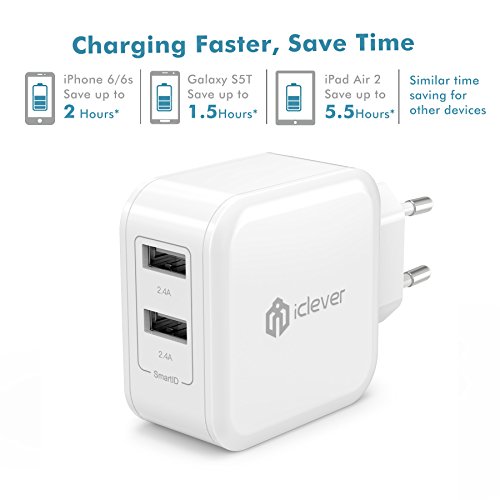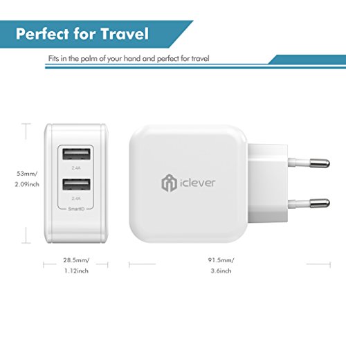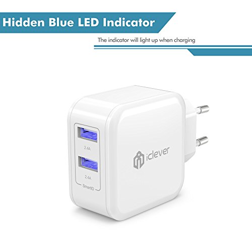 - Feature : iClever® - Amazon's Best-selling Charger / SmartID Technology: recognizes the electronic device and maximizes charging efficiency. Charge faster and save time / Powerful Capacity: 24W/4.8A dual USB output lets you charge any two smartphones or tablet devices simultaneously, at top speed / Safe and Sturdy Design: lightweight, compact and easily portable. Fits in the palm of your hand and perfect for travel. Hidden blue LED power indicator. Contains internal protection mechanisms / Reliable and friendly customer service ready to respond within a 24 hour time frame. 30-Day Money Back Guarantee, 12 Month Replacement Warranty and Lifetime Support Guarantee