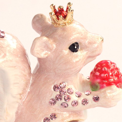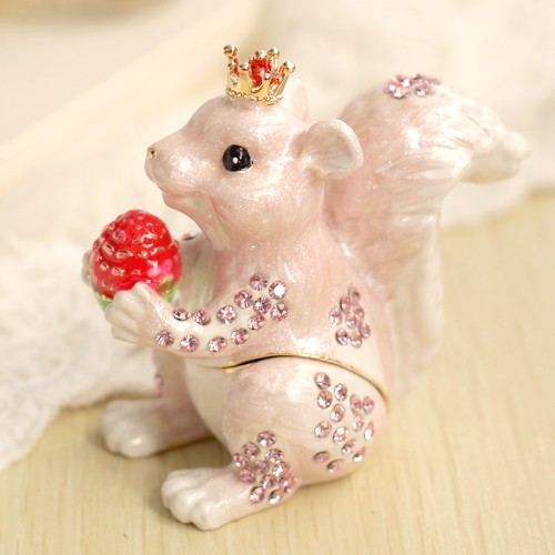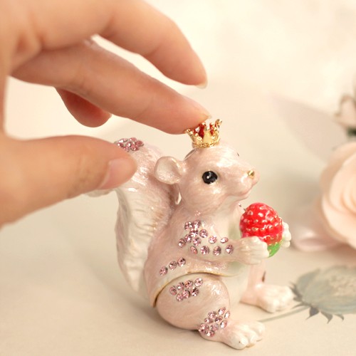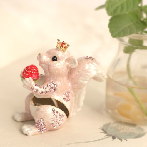 | ジュエリーボックスと言えば、指輪やピアス、ネックレスなどのアクセサリーを入れる引き出し型のケースを思い浮かべる方が多いかもしれません。 ピィアースのジュエリーボックスは、動物や花などをモチーフに作られ、合金製でずっしりとした重さがあります。また高品質のクリスタルガラスを贅沢に使用。まるでジュエリーボックスそのものが宝石のような、高級感溢れる仕上がりです。 小物入れとしても使えるように開閉口には磁石が取り付けてあり、アクセサリーなどなくしやすいアイテムの収納ができます。キラキラと美しく輝く宝石箱は、そのまま飾って楽しめるインテリア雑貨として多くの方に愛されています。 国内トップクラスのジュエリーボックスメーカーであるピィアースは、2004年ごろから本格的に宝石箱の製造を始め、現在のジュエリーボックスはなんと300種類以上。大規模展示会でもご好評いただいており、全国有名百貨店でも販売されています。 自社工場でひとつひとつ丁寧に手作りし、原型作成、研磨、加工、着色、小さなクリスタルガラスの取り付けなども全て手作業で行われるこだわりのハンドメイド品。完成後は厳しい検品の後、丁寧に梱包作業をしお客様にお届けしております。 ピィアース商品は、全国有名百貨店および全国有名宝石店チェーンにてお取り扱いいただいている高品質商品です。 ★自分へのご褒美に…コレクションして並べて飾ると、さらにかわいらしさUP! ★恋人へのプレゼント…中にアクセサリーを入れて、サプライズな贈り物として ★家族への感謝ギフト…お母さんや姉妹へ、日頃のありがとうの気持ちを込めて ★誕生日プレゼント…お友達の喜ぶ顔が見たいから、いつもと違うキラキラギフトを ★小さな女の子へ…まるでお姫様が使っているようなキラキラ宝石箱は女の子の憧れ! |