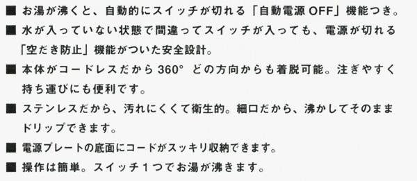 | コーヒードリップに適した細い注ぎ口の電気ケトルです。沸かしてそのまま直接ドリップすることができます。0.8Lの水が約4分~7分で沸騰します(室温や水温により多少異なります)。お湯が沸くと、自動的にスイッチが切れる「自動電源OFF」機能つき。コードレスなので、注ぎやすく持ち運びも楽々♪ステンレス製だから、汚れにくくて衛生的!! |