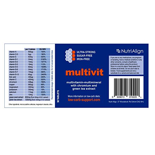 -. Feature : Im Gegensatz zu generischen Präparaten wurde dieses Produkt nur für Personen entwickelt, die eine Low-Carb-Diät machen. Es eignet sich daher perfekt für die Atkins-Diät sowie andere nicht-vegetarische Low-Carb-Diäten (Dukan-, Keto-, und South-Beach-Diät) / Multivit enthält 23 extra starke Nährstoffe, die sorgfältig ausgewählt wurden, um Ihre Diät zu unterstützen. Enthält besonders hochdosierte B-Vitamine und Vitamin C, Chrom, L-Carnitin und Grüntee-Extrakt. Nicht überzogene Tabletten - keinerlei Kohlenhydrate, zuckerfrei, glutenfrei. Ohne Eisen. / Vollständig konform mit allen EU-Verordnungen über Nahrungsergänzungsmittel, Zugelassen durch das britische Trading Standards Institute. Hergestellt in Großbritannien nach ISO 9001 und GMP-Standards. Bewährt und erprobt von Personen, die Low-Carb-Diäten einhalten. / Es fördert Ihre Fettverbrennung und hilft Ihnen bei der Anpassung Ihres Stoffwechsels an den Low-Carb-Gewichtsverlust. Es reduziert Ihr Verlangen nach Süßem, damit Sie kohlenhydratreichen Versuchungen leicht widerstehen können. Es steigert Ihre Energie und Leistungsfähigkeit, damit Sie Ihren Alltag problemlos bewältigen können. Es versorgt Sie mit extra starken Vitaminen, die auch in kohlenhydratreichen Nahrungsmitteln enthalten sind (z. B. Getreide und Obst), damit Sie sich keine Sorgen um eventuellen Nährstoffmangel machen müssen