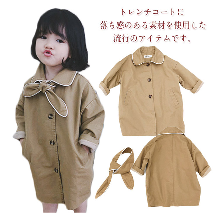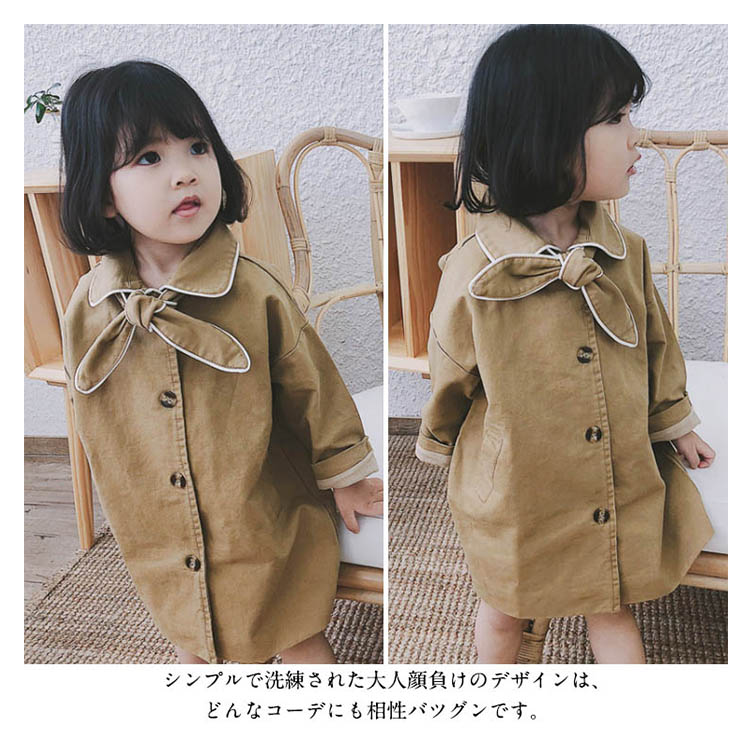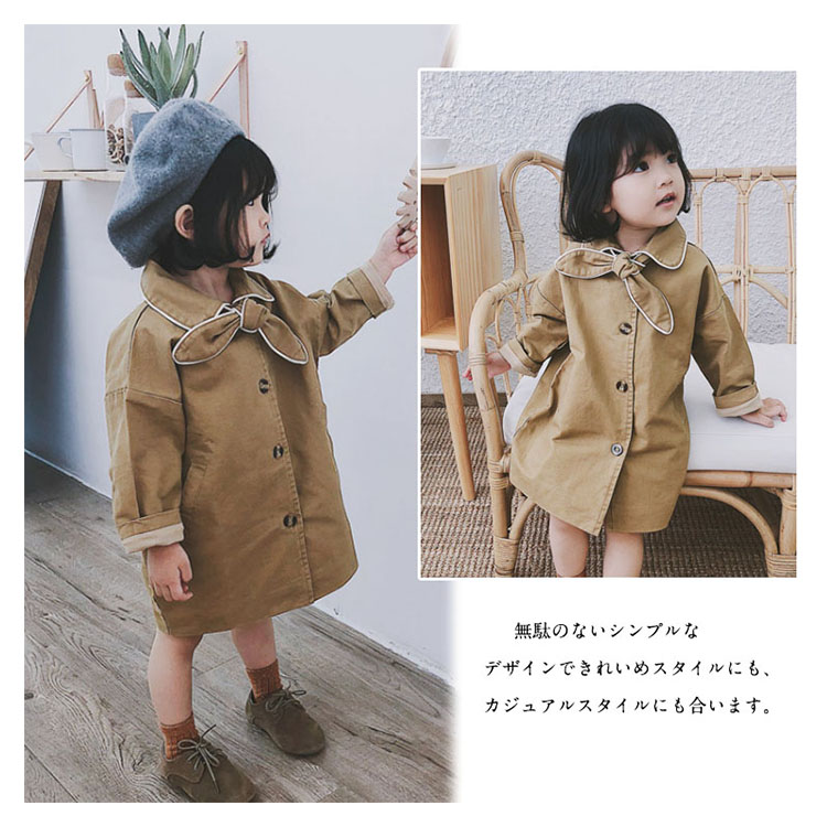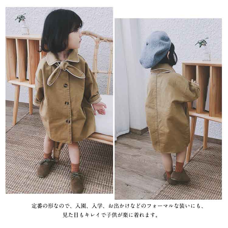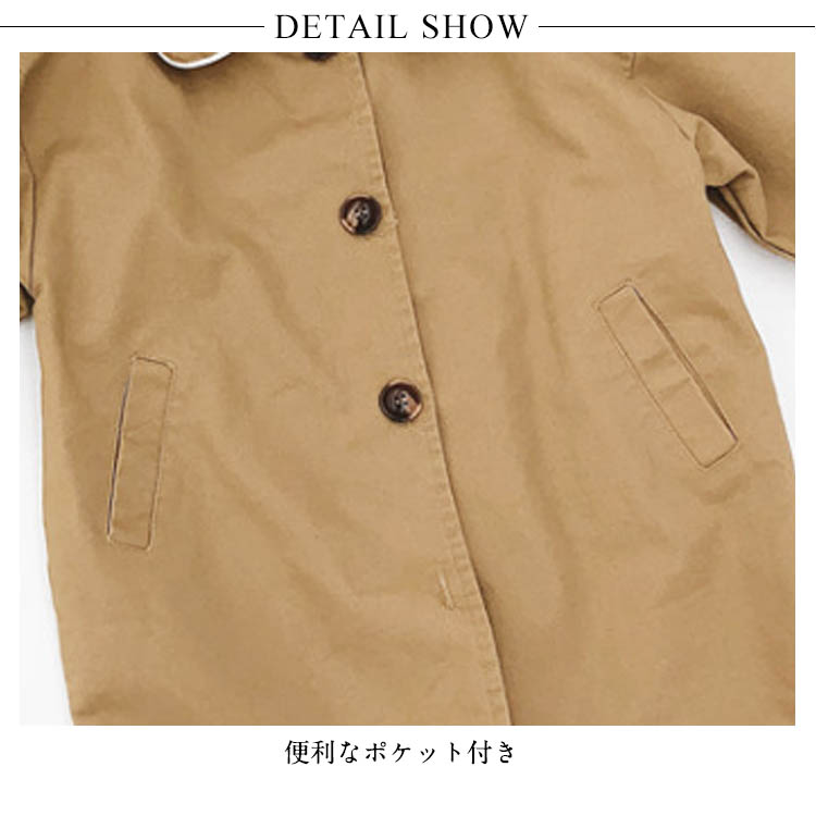 | トレンチコートに落ち感のある素材を使用した流行のアイテムです。シンプルで洗練された大人顔負けのデザインは、どんなコーデにも相性バツグンです。無駄のないシンプルなデザインできれいめスタイルにも、カジュアルスタイルにも合います。定番の形なので、入園、入学、お出かけなどのフォーマルな装いにも、見た目もキレイで子供が楽に着れます。 | |