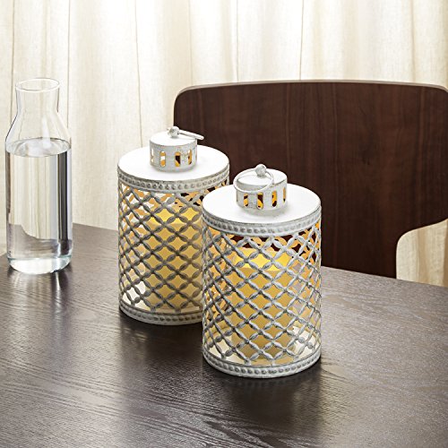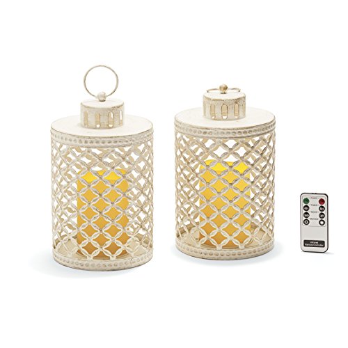 Description: Set of 2 white distressed lanterns with brass brushed metal in an intricate lattice pattern. Each Lantern includes a resin water resistant candle.