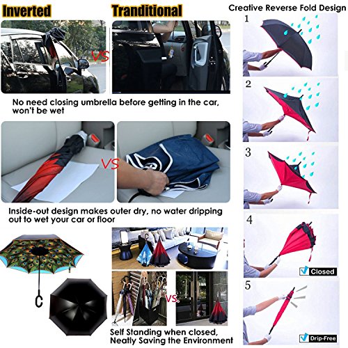 The Upside Down Umbrella helps you solve rainy day troubles 1. When you are exiting or entering your car, your car door has to be open rather wide in order to get it closed or open, during that moment, a good amount of rain still get you and your car rather wet. With this brilliant new design, your door only needs to be open slightly as the umbrella opens "in reverse". This keeps you drier less of a smelly car 2. When you jump on a crowded train after escaping a downpour your dripping wet umbrella usually brushes up against your bag, your clothes or -even worse- a stranger. But by inverting the design, the wet side of the umbrella faces inward when closed, exposing only the dry side. And that's not all: the creative design makes it easier to open when coming out of a car or other covered area, and when not in use the umbrella can stands up on its own Flashlight Design in the handle with 2 modes. One pressing the button to get torchlight to light for repairing car, walking and more, Two pressing the button to get the colorful strobe light, for SOS helping signal also can warn the car keep away from you in the road. The torchlight can be taken down from the handle as a single torchlight if you don't want bring the umbrella. Good Material makes it durable Umbrella Ribs: high tenacity, inoxidizability, stainless, last its life; Umbrella Cloth: Nanometer cloth for layers, waterproof, Adopts 210T,50D Nanometer cloth,high density,thin but not white out. Umbrella Rod: made from imported aluminum alloy, durable and not easy to break off. Package Included: 1* multi functional inverted umbrella 2* umbrella carrying bag 3* LR44 button cell(installed in the umbrella) 0