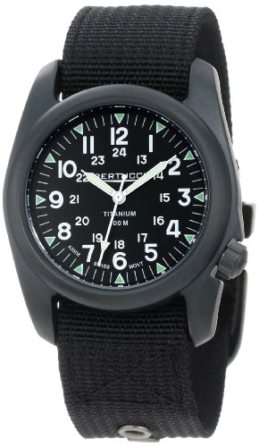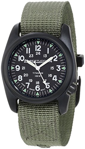 Sport watch, Precision Swiss quartz movement, Polished white sword hands with luminous accents and luminescent sweep seconds, Applied polished white Arabic numbers, Smaller applied polished white Arabic numbers form inner 24-hour time track, Applied luminescent green triangular hour markers and white indices form surrounding minute track, Marine green dial, U.S. patented DX3® heavy duty 2-ply drab nylon strap with contrast stitching and brushed black metal buckle, U.S. patented DX3® matte silver-tone titanium bezel and round case, Textured titanium screw-down crown with logo, Titanium screw-down caseback, Mineral crystal, 100 meters/328 feet water resistantFeature