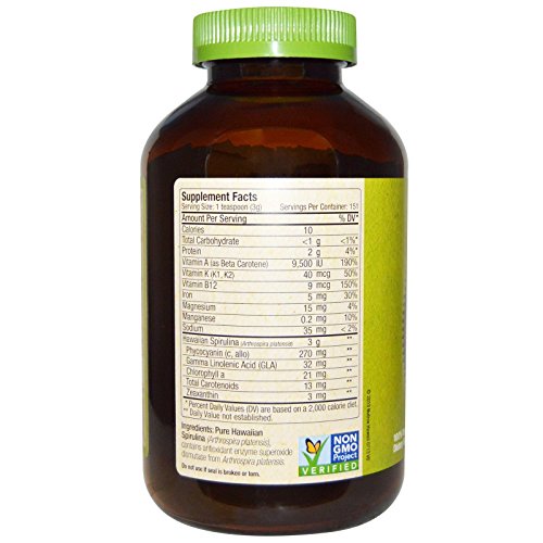 Studio : Nutrex Hawaii Publisher : Nutrex Hawaii Binding : Health and Beauty Product Description Nutrex Hawaii Pure Hawaiian Spirulina Pacifica Description: More Nutrition Nature's Multivitamin 100% Vegetarian Supports total health for longevity. Spirulina Pacifica supports cardiovascular, eye and brain health, boosts immunity and energy. It is the most complete food source in the world with over 100 nutrients, 60% protein content, the highest levels of carotenoids, and high in antioxidants known to promote health and longevity. Ideal for vegetarians. Our farm, the only Spirulina farm in Hawaii, has been cultivating Spirulina continuously for over 25 years with Hawaiian deep sea water containing 94 trace minerals in a BioSecure zone free from pollution. Improve your health today with Spirulina Pacifica. Disclaimer These statements have not been evaluated by the FDA. These products are not intended to diagnose, treat, cure, or prevent any disease. 0