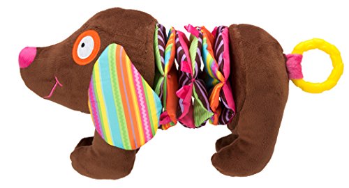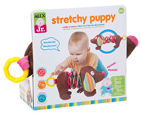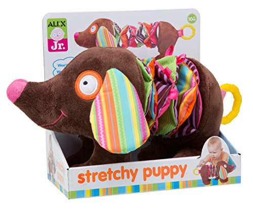 ALEX Jr. Stretchy Puppy is a soft and cuddly plush puppy. Great for a stroller or car seat, baby can stretch the cute puppy, and watch his colorful body crinkle and grow. Squeak his nose and pull on his tail which doubles as a teething ring. Bold colors, patterns and textures inspire sensory exploration. Includes a stretchy puppy, perfect for strollers and car seats. Recommended for children 10 months of age and older.Feature