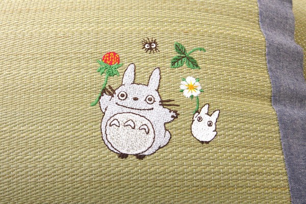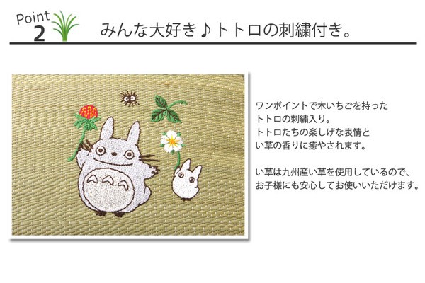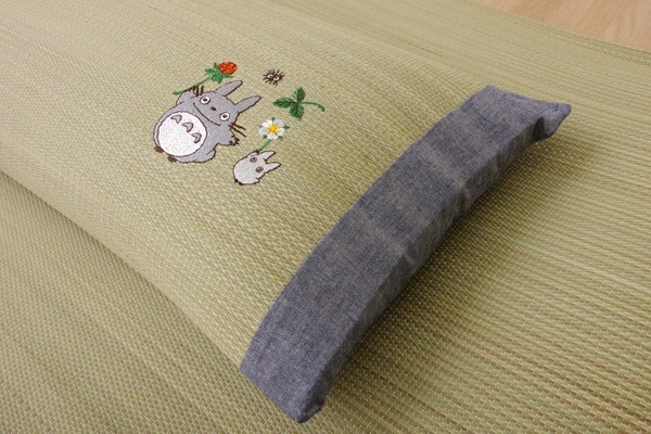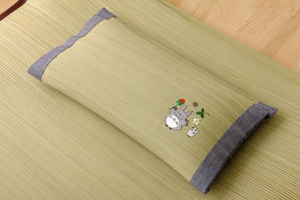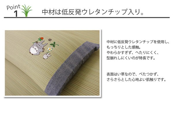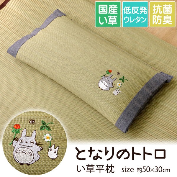 となりのトトロをあしらったイ草枕です。快眠い草の効能として1.綿の約2.5倍の吸湿力 2.蒸れにくい。汗による湿気を吸うことにより温度を下げ快適な就寝を促します。 3.汗のにおいを軽減。汗のにおいの元となる化学物質を90%以上抑えます。などがあります。国産(九州産)のしなやかなイ草を使用していますので、柔らかく、すべすべしたとした肌触りです。中材には低反発ウレタンチップを使用しています。柔らかすぎずヘタリにくく、型崩れしにくいのが特長です。い草の表面に天然青森ヒバ加工を施しています(抗菌・防臭効果)。青森県のヒバの木から抽出した「ヒバ油」をメーカー独自の技術で材料や商品に加工しました。「ヒバ油」には、ヒノキチオールという天然物質としては極めて抗菌性の高い成分が含まれ、医療や食品など多分野で利用研究が進められています。