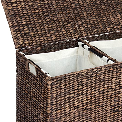 Studio : Best Choice Products Publisher : Best Choice Products Binding : Kitchen Product Description Best Choice Products presents the new Water Hyacinth Double Laundry Hamper. This double laundry hamper is constructed with natural woven water hyacinth for an espresso/honey blend that can complement most bedroom setups. The basket has a divided interior to allow you to keep your laundry sorted when dirty and nicely organized after the wash. We've equipped this hamper with an attached lid to keep odors confined, as well as cut-out handles to make transportation hassle-free. Two removable machine-washable cotton canvas liners are also included to protect your clothes and the interior of your hamper. Pick those dirty clothes up from the floor with the Water Hyacinth Double Laundry Hamper by Best Choice Products! SPECIFICATIONS: Overall Dimensions: 27.75"(L) x 13.5"(W) x 27"(H); Sectional Interior Dimensions: 14"(L) x 13"(W) x 24.5"(H); Weight Capacity: 28 lbs.; Weight: 13.3 lbs.; Color: Espresso, Honey; Material: Water Hyacinth; No assembly required 0