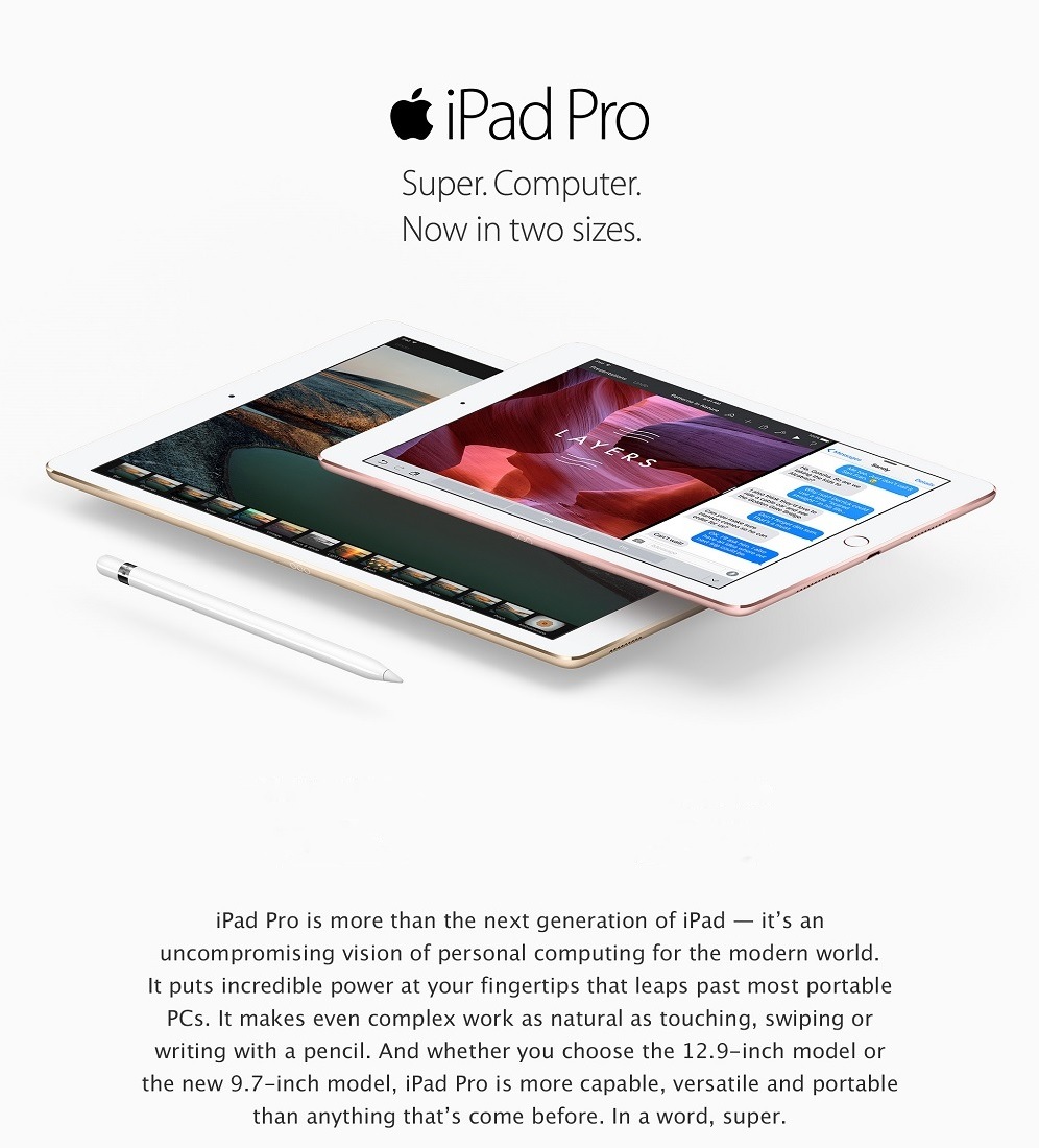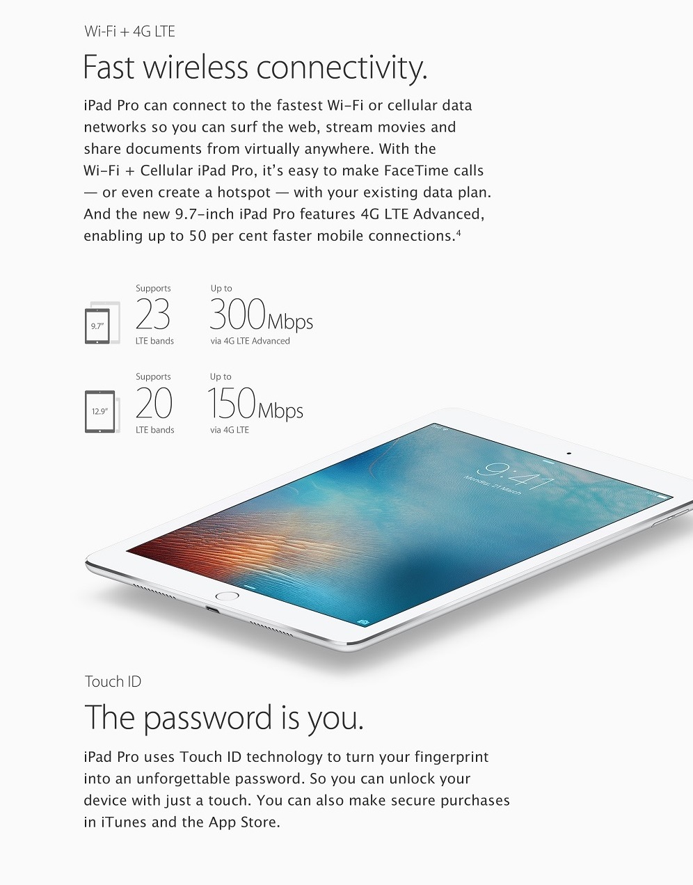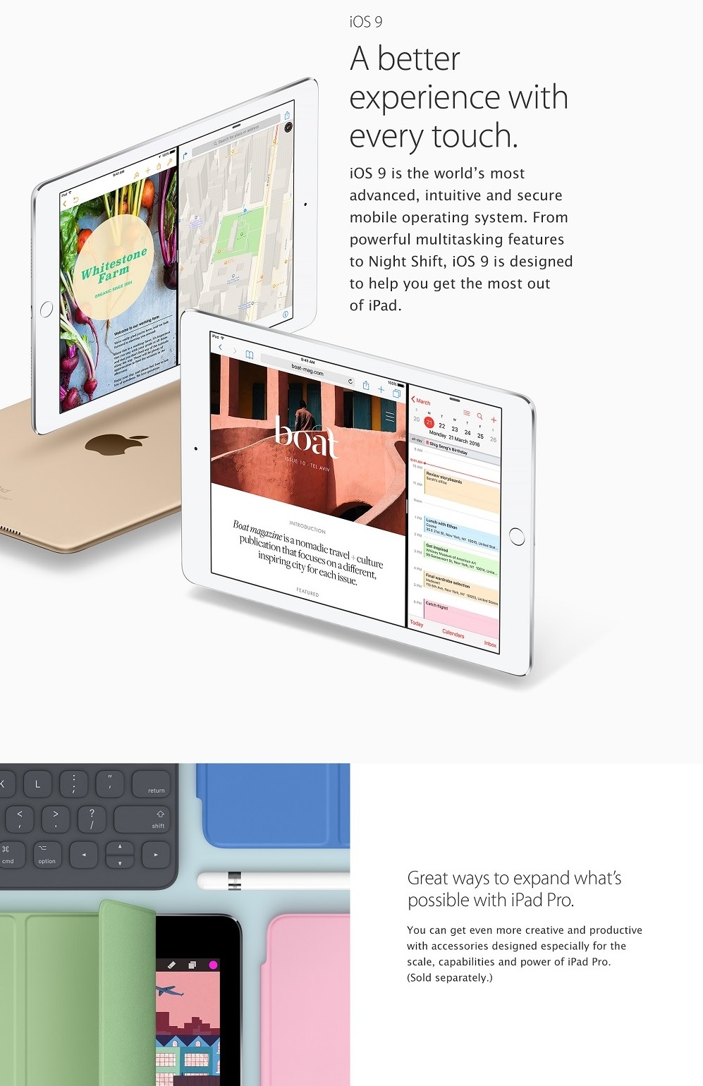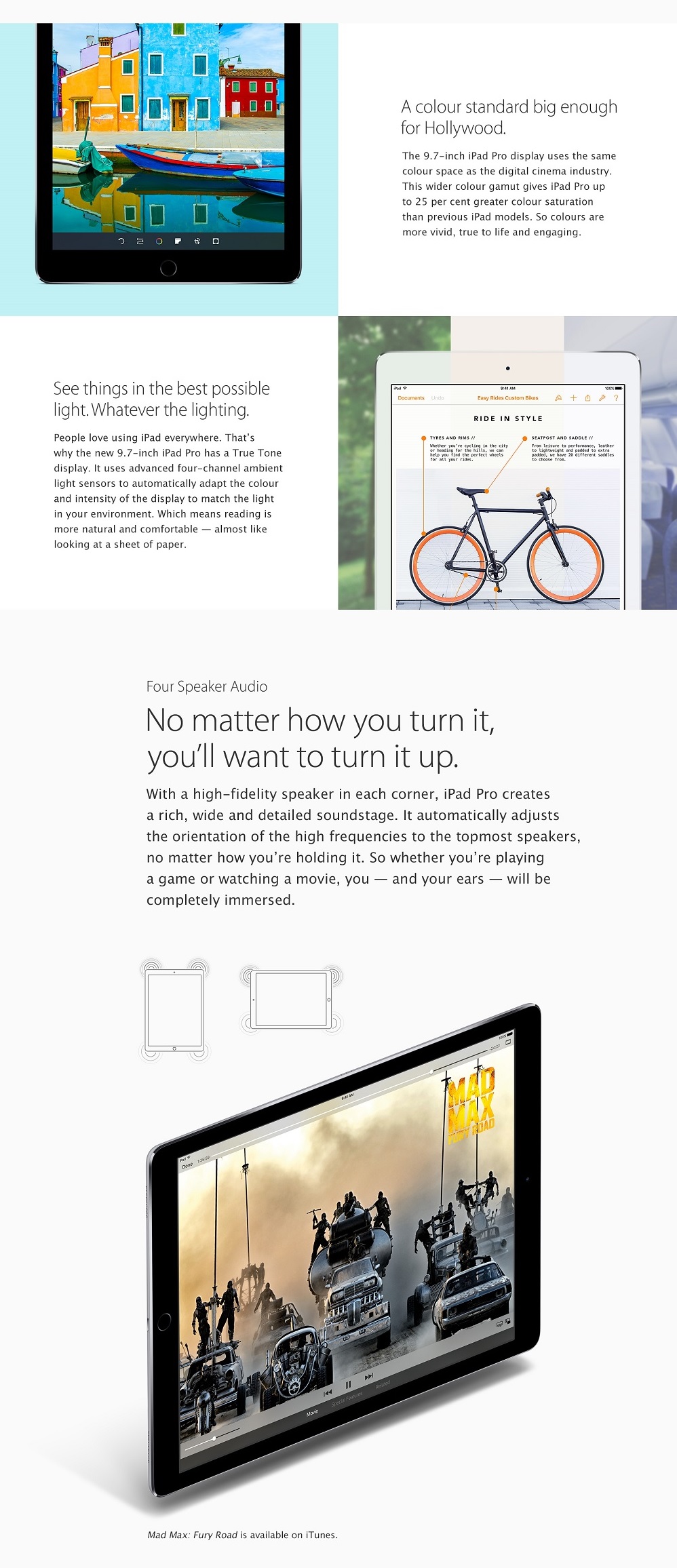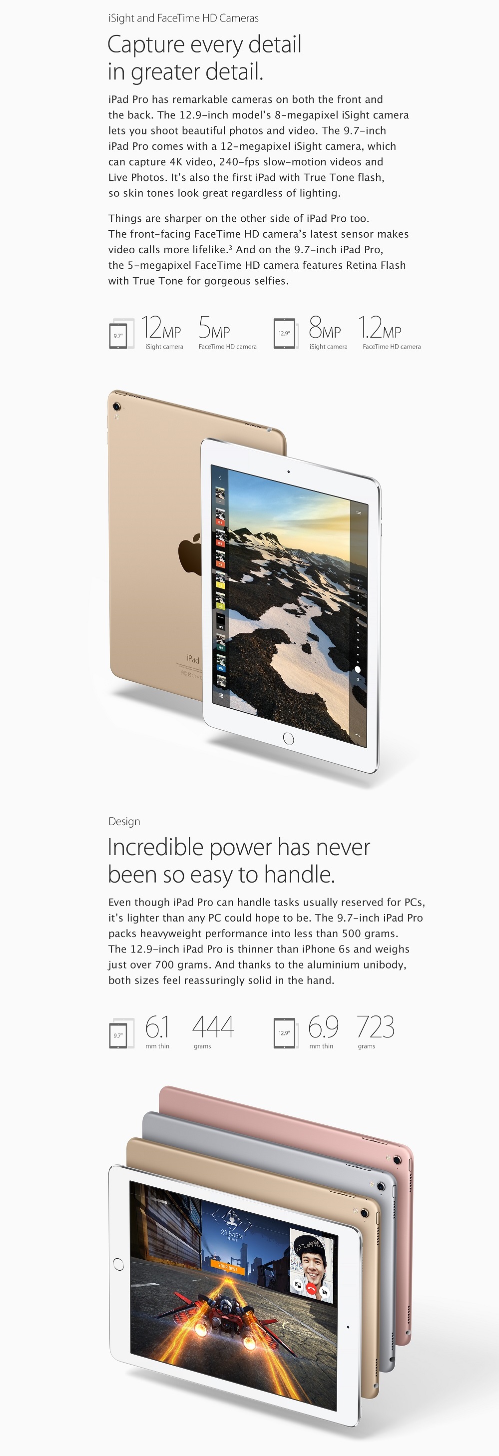 The 9.7-inch iPad Pro delivers an unprecedentedu0026nbsp;combination of portability and performance. At justu0026nbsp;6.1mm thin and weighing less than a pound, iPadu0026nbsp;Pro features the brightest, most advanced Retinau0026nbsp;display ever with True Tone, advanced sensors thatu0026nbsp;adjust the display to your environment for evenu0026nbsp;more comfortable viewing. It has a powerful A9Xu0026nbsp;chip with 64-bit desktop-class architecture, fouru0026nbsp;speaker audio, advanced iSight and FaceTime HDu0026nbsp;cameras, Touch ID fingerprint sensor,u0026nbsp;ultrafast Wi-Fi,u0026nbsp;and up to 10 hoursu0026nbsp;of battery life.2u0026nbsp;When you add Apple Pencil withu0026nbsp;its pixel-perfect precision, and the incredibly thinu0026nbsp;Smart Keyboard, iPad Pro becomes evenu0026nbsp;more versatile.*