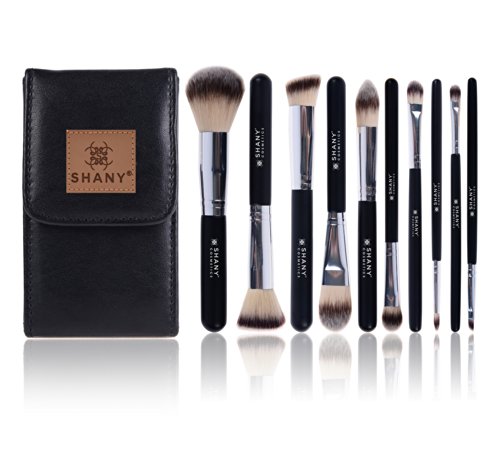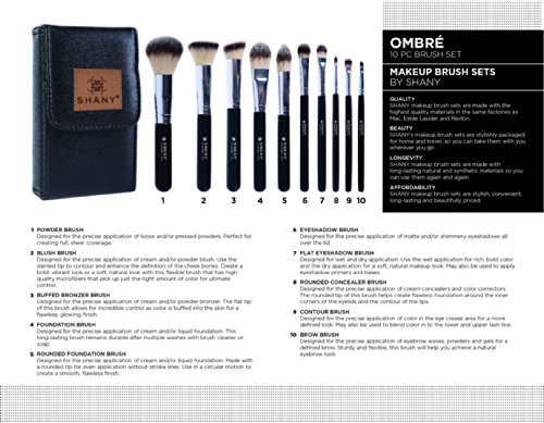 This set includes 10 synthetic cosmetics brushes with an elegant travel makeup pouch