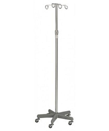 Deluxe aluminum IV stand with 4 prong hanger, 5 leg (17" diameter) cast iron base (for greater stability) and 1 1/2" diameter heavy duty ball bearing casters. Locking clutch nut provides for full range of adjustment from 46" through 81". Product Specifications - Quantity: 1pc