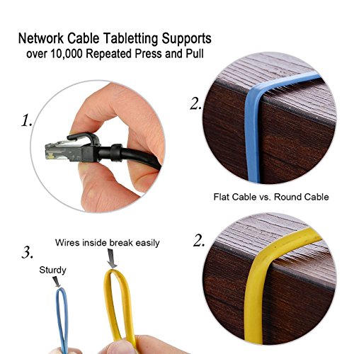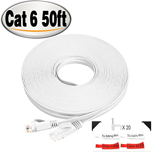 Slim and Flat, Super Flexible With 1.4mm thin, the PeggieHome-TBMax flat ethernet cables slide under the carpet without raising it or showing that it is under there? Turn corners easily, you do not have to drill holes in walls or floors, the flat cables go through the doorways smoothly?Easy to wrap. Rolls up tangle free and is compact when traveling? High Speed and Reliable The Cat6 cable provides exceptional transmission performance and low signal losses. It supports up to 250 MHz and is suitable for Fast Ethernet, Gigabit Ethernet? Compared to the Cat5/Cat5e Ethernet cable, the improved quality in twisting of the wires provides better immunity from crosstalk, noise, and interference that can degrade the signal quality Best Package for Home and Office Network The RJ45 connectors offer universal connectivity to network computers, routers, switch,network printers, streaming server, and network attached storage devices. Premium snagless-type moldings to Surf the Internet, play internet high speed games, stream video, music, and other data at greater speed without worrying about cable mess?.Bundled with installation accessroies of cable clips and cable sticky labels,no need to buy else. Specification Category 6 Ethernet Patch Cable CAT6 4-Pair UTP Cable Diameter: 0.23 ± 0.01 inch 100% Bare Copper Backward compatible with Cat5e/Cat5? Supports: 1000 BASE-T Ethernet; 100 BASE-T Ethernet; 10 BASE-T Ethernet Snagless RJ45 connectors? Slim and flat profile helps avoid tangles and save space? ROHS EIA/TIA compliant Cable Length: 50 ft? Compatibility Routers? Switches? Network Printers? Network Storage Device? Computer Internet TV servers Extenders