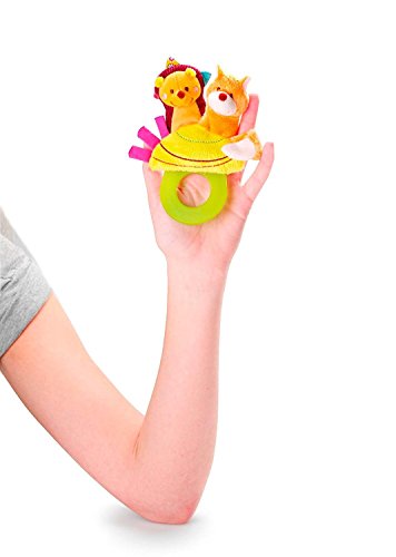 This versatile rattle from Lilliputiens is three delightful toys in one! A teether, pair of finger puppets and a pacifier holder (pacifier not included)