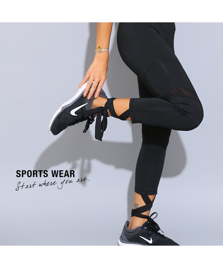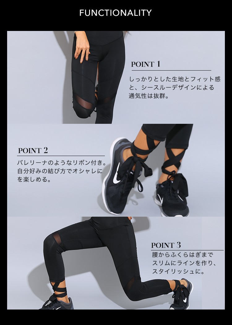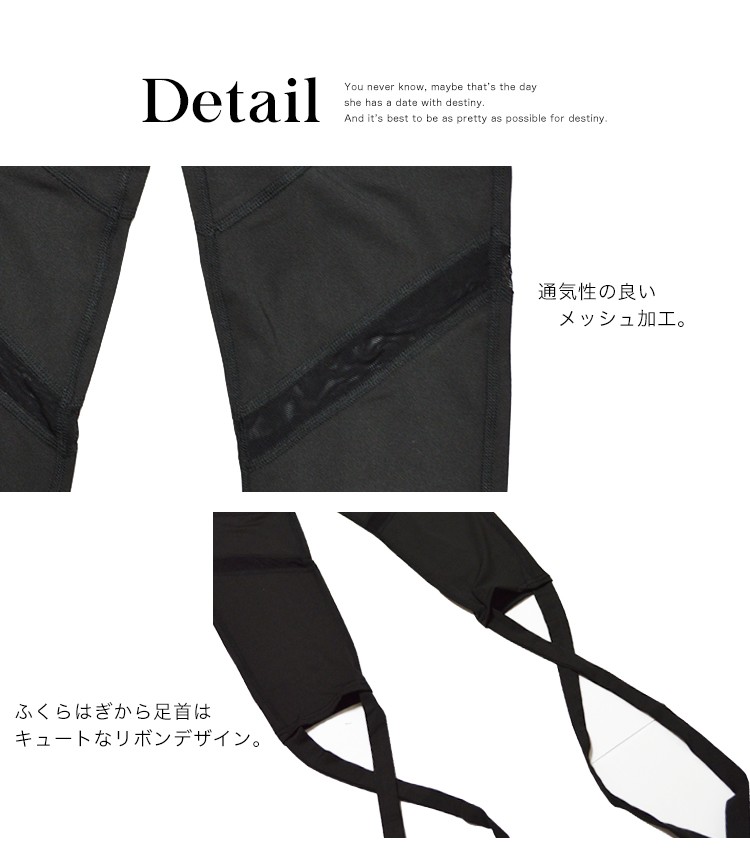 | 商品特徴 | LAVIA SPORT(ラヴィアスポーツ)から新作のスポーツウェアが入荷しました。サラサラとした素材、しっかりとストレッチが効いた生地を使用した七分丈のバンツです。のびーる生地に加え、メッシュ加工もされているので通気性に優れていて運動中の身体を快適にサポートしてくれます。裾から伸びる紐でふくらはぎから足首にかけて自分なりの結び方でお楽しみ頂けます!ダンス、バレエ、ヨガ、フィットネ時におすすめです。 |