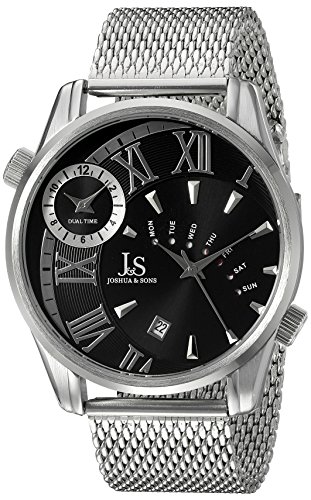 -. Binding : Watch -. Brand : Joshua & Sons -. Color : Black -. Department : mens -. EAN : 0848572074803 -. Feature : Radiant black sunburst dial with two time zones and date complication / Individually hand applied silver tone roman numerals and stick index with silver tone dauphine style hour and minute hands / Polished and brushed silver tone alloy case with fine mesh stainless steel bracelet / Quartz movement with analog display / Water-resistant to 30 M (100 feet) -. Label : TWI Watches, LLC -. Manufacturer : TWI Watches, LLC -. Model : JX112SSB -. MPN : JX112SSB -. PackageQuantity : 1 -. PartNumber : JX112SSB -. ProductGroup : Watch -. ProductTypeName : WATCH -. Publisher : TWI Watches, LLC -. Studio : TWI Watches, LLC -. Title : Joshua & Sons Men's JX112SSB Round Black Dial Three Hand Quartz Bracelet Watch -. UPC : 848572074803