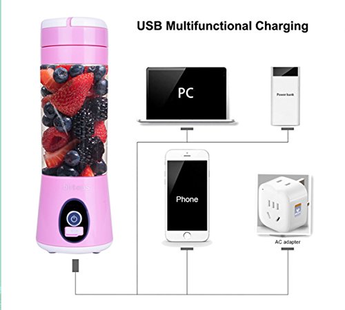 Attention: 1.Please charge the battery before using the juice blender. You can use kinds of mobile phone charger, computer USB ect. To charge the product for 3 hours. 2.During charging, please do not use the blender cup. 3.If the motor seems to be struggling at a low speed,please add some water or milk. 4.Meat,beans,nuts,ice cubes or other hard food are not recommended to grind with. 5.When clean the product, please make sure the power switch is off, then clean the cup cover/body/base. 6.The ideal time is 5 senconds, then red light flicker; Working time is 60 seconds and will automatically stop, then light green light flicker, you can reset the switch and re-start the machine to continue use the blender. Please not over use the machine, incase the electronic components or motor over heat, affect product lifetime. Specification: Condition: New Cup lid material: Food grade ABS Cup body material:Food grade PC/AS Cup base material:Food grade ABS Blade Material:Stainless steel Motor specifications:DC7.4V Motor speed:NO load 22000circle/min±15% Load 18000circle/min±15% Batter:2000mAh 3.7V x2 Volume: 380ml Voltage:7.4V Working current:5-10A Full recharge time: about 3 hours and you can make 5 cups of juice. Package Includes: 1 X Portable juicer Cup 1 X Bottom cover of water bottle 1 X User manuel
