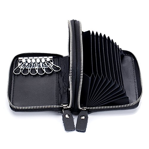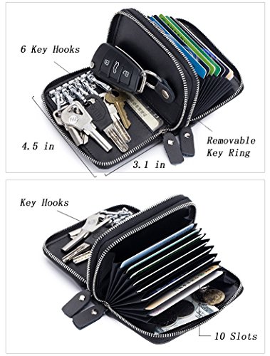 -. Feature : Compact Size: 4.5" x 3.1" x 1.5" (11.5cm x 8.0cm x 3.8cm); About 5 ounces / 10 credit card slots, 6 metal hooks for home keys, 1 removable key ring for car key fob / RFID blocking lining protect your cards from unexpected scanning / Genuine cowhide leather, Polyester lining; Heavy-duty metal zipper, smooth and durable / 2 in 1 design, organizes credit cards, coins, cash, keys, card key fob in 1 compact wallet.