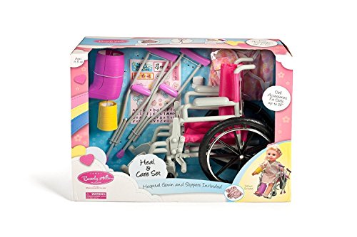 Beverly Hills Doll Collection Wheelchair and Hospital Gown Will Make your Doll Well Again! Here is some features. Fabric on wheel chair is removable for washing. -Wheel chair is foldable and has a brake mechanism. -For ages 4 years old and up. -Includes wheel chair, hospital gown and slippers, crutches, casts and stickers. Dimensions: Overall Product Weight: -4 Pounds. Overall Depth - Front to Back: -8.8 Inches. Overall Width - Side to Side: -12 Inches. Overall Height - Top to Bottom: -10.5 Inches. Foldable wheelchair & crutches that fits up to 18" dolls. Set included a foldable wheelchair, a pair of crutches, foot plaster cast, arm plaster cast, plastic bandage, fingertip pulse oximeter & a cold pack.Feature