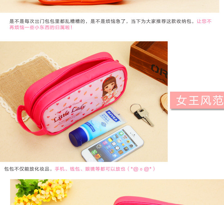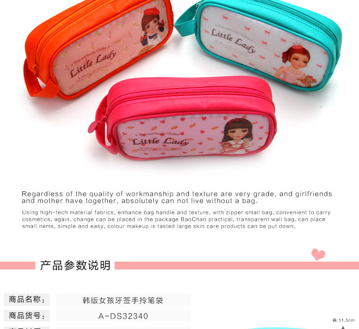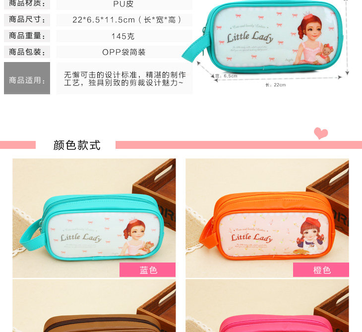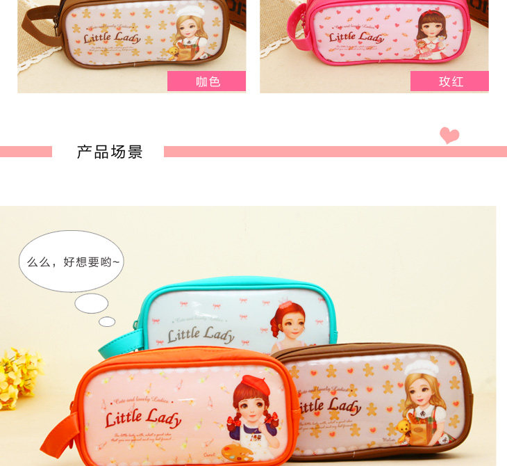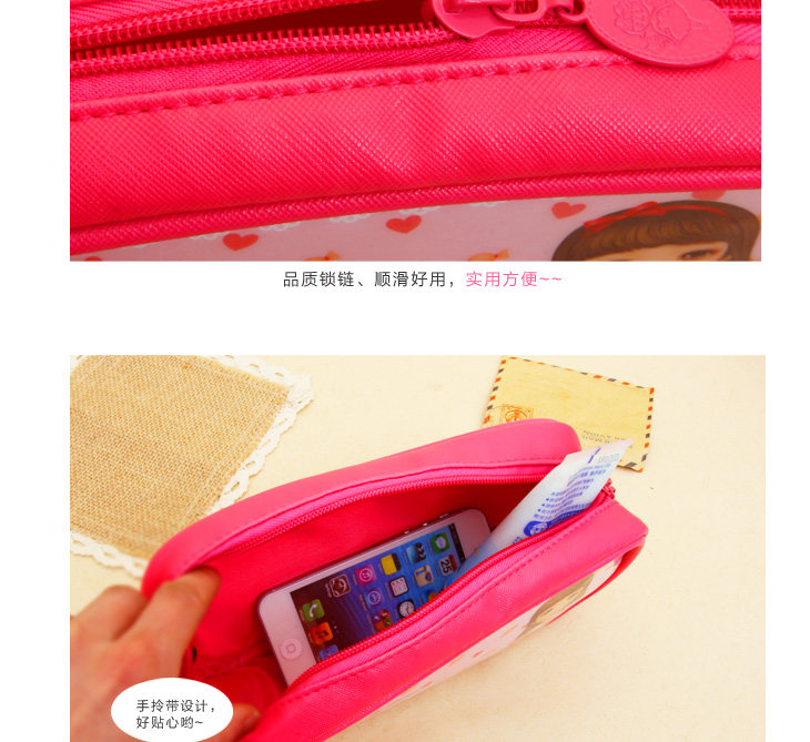| Product Description | Neat appearance without much rhetorical decoration, lovely doll patterns, unique taste young. Colorful multicolor, suitable for different ages choose oh ~ fabric work well, lining is also very good, exclusive brand zippers, smooth and easy to pull. Wrapping and sewing delicate traces durable. Excellent capacity to meet your needs. Yet soft texture of leather, zipper design adds a lot of color to the bag, portable design, more convenient travel carry beautiful colors very wild, each pattern is very adorable, illustration surface, showing the cozy cute style , natural, fresh, learning essential Oh! |