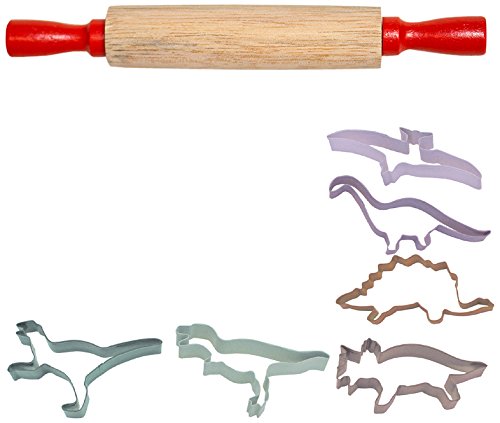 Vibrantly colorful set of cutters that inspires creativity. Cutters are made of durable, kiln-fired polyresin-coated tinplate steel. Finish is stain- and chip- resistant and dishwasher safe (top rack). The designs are detailed. Includes a kid-sized, wooden rolling pin and recipes for fun-dough and sugar cookies. Makes a great gift. Shipped in a clear-topped box.Feature