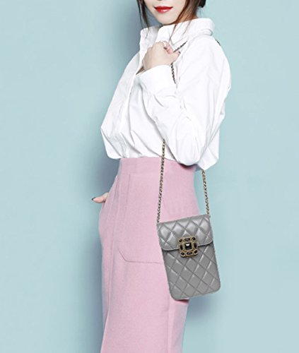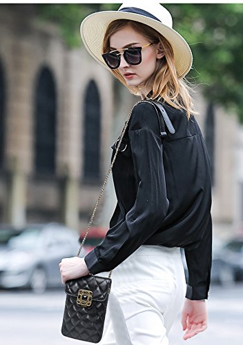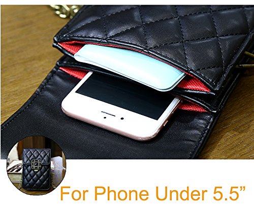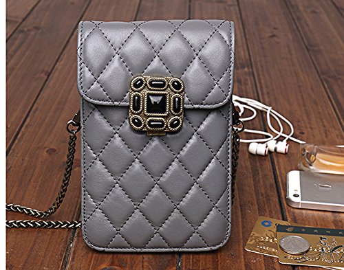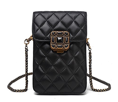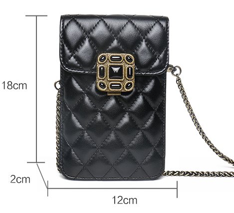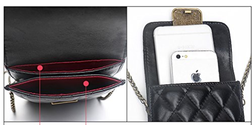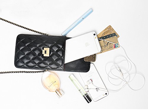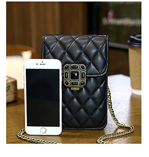-. Feature : Mini cellphone crossbody bag purse, pretty chic accessory to finish your outfit, practical use for daypack, traveling, school, cycling, camping, dog walking, around town and more / Made of high grade PU leather, premium smoothy zipper, soft to touch, longlasting / Fashionable diamond patterned, vintage square rhinstore clasp for easy closure and access to / Spacious Internal Space, 2 divided compartments for stashing card, cash, purse, passport, chargers, keys, pens, mobile phones under 5.5 inch / Bag Size:18*12*1.5cm. Single shoulder metal chain for cross shoulder and easy carry