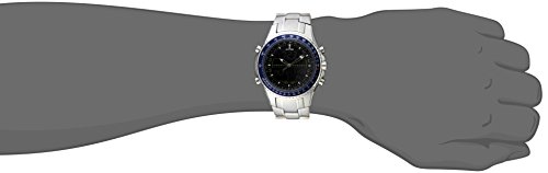Stainless steel case measures 46mm diameter by 16mm thick. Brushed and polished link bracelet includes a fold over deployment clasp. Digital and analog dial with luminous hands and hour markers. Chronograph and three alarm functions. World time with daylight savings setting. Count down timer. The scratch resistant mineral crystal protects the precise Quartz movement. Water resistant. Case measures 46mm diameter by 16mm thick. 0