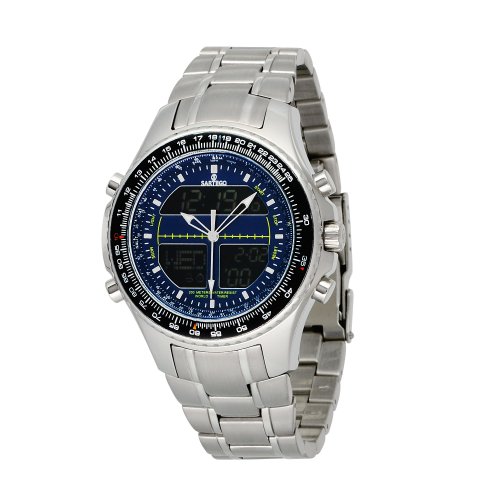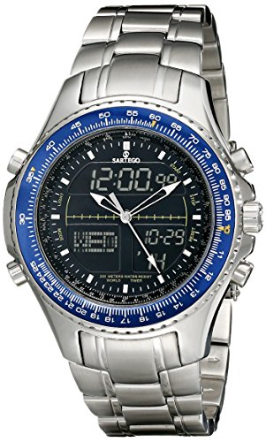 Amazon.com Product Description Showcasing a brilliant blend of digital convenience and classic analog design, the Sartego Men's World Timer Quartz Chronograph Watch #SPW31 is a daily-wear watch that goes above and beyond to help you keep track of life's details. Its blue face features black digital time and date displays set under a trio of hands with silver-tone frames and luminous accents. The outer dial provides luminous bar indexes with silver-tone frames on the hours and slim white stick indexes on the minutes, while a tachymeter on the flange and a unidirectional bezel with a distinctive black finish both add to the watch's appeal. A variety of modes lets you track real time and 12-city world time, timer and chronograph readings, and alarm settings, while a traditional stainless steel bracelet band and a fold-over clasp with a safety secure the timepiece in place. Also offering the durability of a Hardlex crystal, the reliability of Japanese quartz movement, and a stainless steel case with a screw-down crown, this elegant multi-function timepiece is water resistant to 660 feet (200 meters). 0