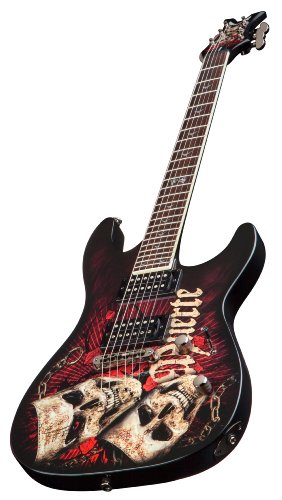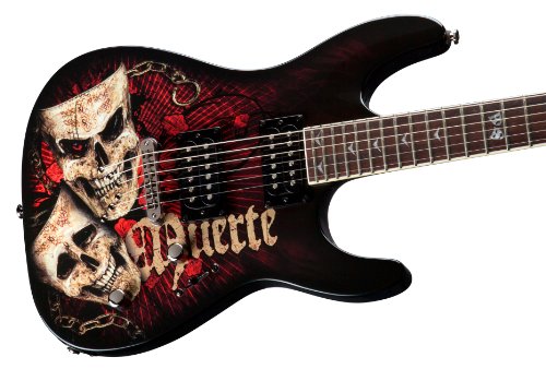 Studio : Dean Publisher : Dean Binding : Electronics Product Description The Dean Vendetta Teatro De La Muerte Electric Guitar has a solid mahogany body embellished with stunning graphics. A set mahogany neck topped with a 24-fret rosewood fingerboard decorated with pearl Vendetta inlays is fast and sweet. Dual DMT design humbucking pickups pump out a huge sound that has searing sustain. Controls include one volume, one tone and a three-way pickup selector switch. Appointments include thru-body string ferrules, black hardware, single-ply neck binding and more Vendetta graphics on the headstock. 0